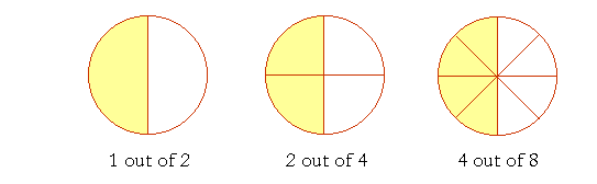 In terms of equal ratios, if a pie is cut into 2 pieces and you eat 1 of them, you will get just as stuffed as when the pie is in 4 pieces and you eat 2; or if you eat 4 out of 8, or 5 out of 10, and so on.  In each case, you have eaten an equivalent "fraction" of the pie, namely half.