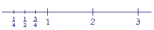 into three equal pieces. Notice that to cut that unit into thirds, we cut it only twice. "One third, two thirds." Since the numerator is to the denominator in the same ratio as two natural numbers, fractions are also called rational numbers. Example 6. This number ¼ is called "one-quarter" or "one-fourth," because the numerator is one quarter of the denominator -- and ¼ itself is one quarter of 1. To place ¼ on the number line, we cut the line one less than the name of the part. To divide 1 into fourths, cut the line three times. Example 7. What number is at the arrow?