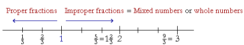 "8 times 3 is 24, plus 5 is 29; over 8." To summarize: Fractions that are less than 1 are called proper fractions, while fractions greater than or equal to 1 are improper. Improper fractions are equivalent to mixed numbers or whole numbers.