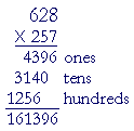 -- follow the same procedure for each digit. However, when we multiply by 5 tens, the product is 3140 tens. Therefore we write 0 in the tens column. When we multiply by 2 hundreds, the product is 1256 hundreds, and so we write 6 in the hundreds column. We can state the rule as follows: |