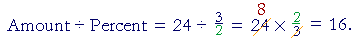 24 is 150% of -- 1½ times -- 16. (16 + 8 = 24.) Thus, if the Amount is more than 100% of a number -- 24 is 150% of 16 -- then that number will be less than the Amount. Therefore, multiply the Amount by the reciprocal of the fractional form of the percent. Example 7. 36 is 225% of what number?