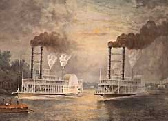 Dos barcos de vapor compiten en el Mississippi. Muy utilizados durante el siglo XIX y principios del XX, los barcos transportaban con rapidez mercancías y pasajeros. Además, proporcionaban entretenimiento, como los barcos en que se representaban obras de teatro a lo largo del río.